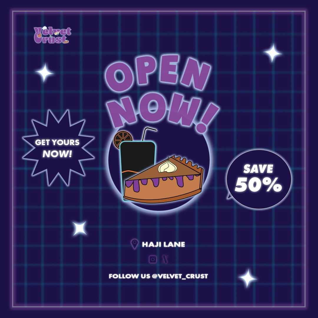 For this Instagram promotional post, I designed these visual element to match the playful, neon glow theme of the Velvet Crust brand. I used a grid style background with glowing accents to create a vibrant and eye catching look suitable for social media. The central illustration of the pie and drink reinforces the shop’s signature offerings, while bold typography like “OPEN NOW!” and “SAVE 50%” grabs attention quickly as users scroll. I placed clear call to actions such as “Get Yours Now!” and the shop’s location and handle to guide viewers directly to the store or Instagram page. The consistent purple colour palette and soft glow effects help tie the post back to the logo and menu, keeping the overall branding cohesive across all platforms.