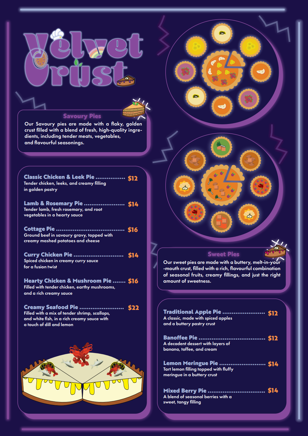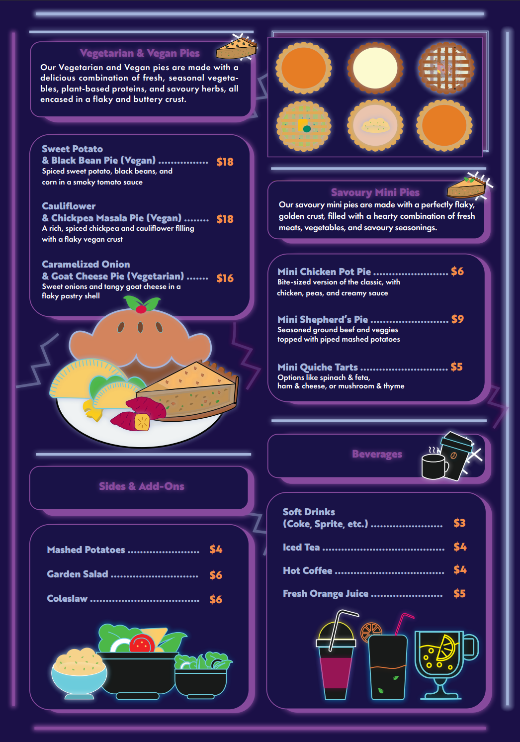 For this menu design, I created every element from scratch, including the illustrations, layout and overall visual style. I chose a deep purple theme with neon inspired outlines to give the brand a warm, whimsical and slightly magical feel that reflects the cosy personality of “Velvet Crust.” I designed the food illustrations to be playful and colourful, helping customers visually connect with the variety of pies offered. The layout is organised into clear sections Savoury, Sweet, Vegan/Vegetarian, Mini Pies, Sides and Beverages so customers can easily navigate the menu. Using consistent rounded shapes, bright highlights and thematic icons helped keep the entire design cohesive and visually engaging.