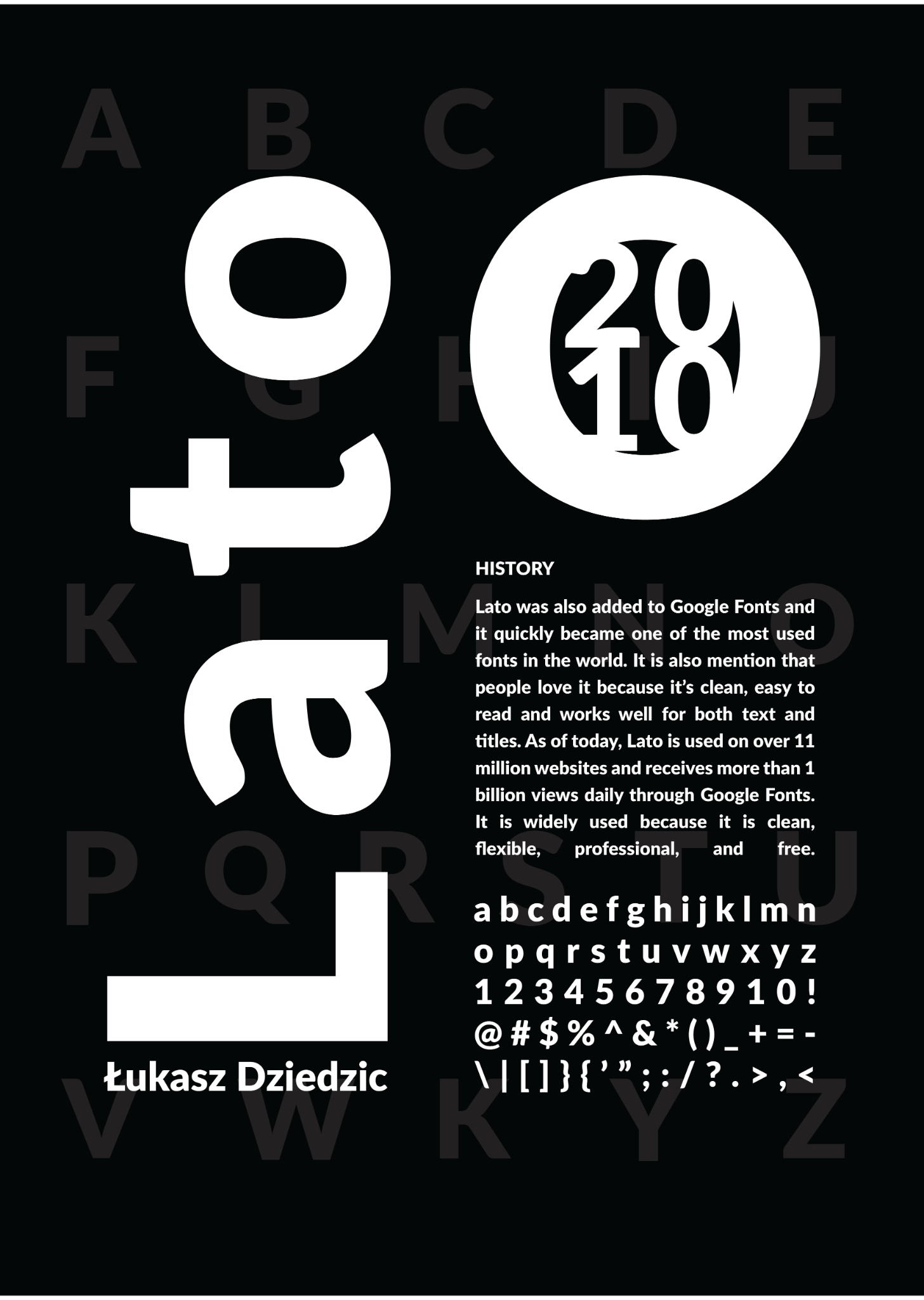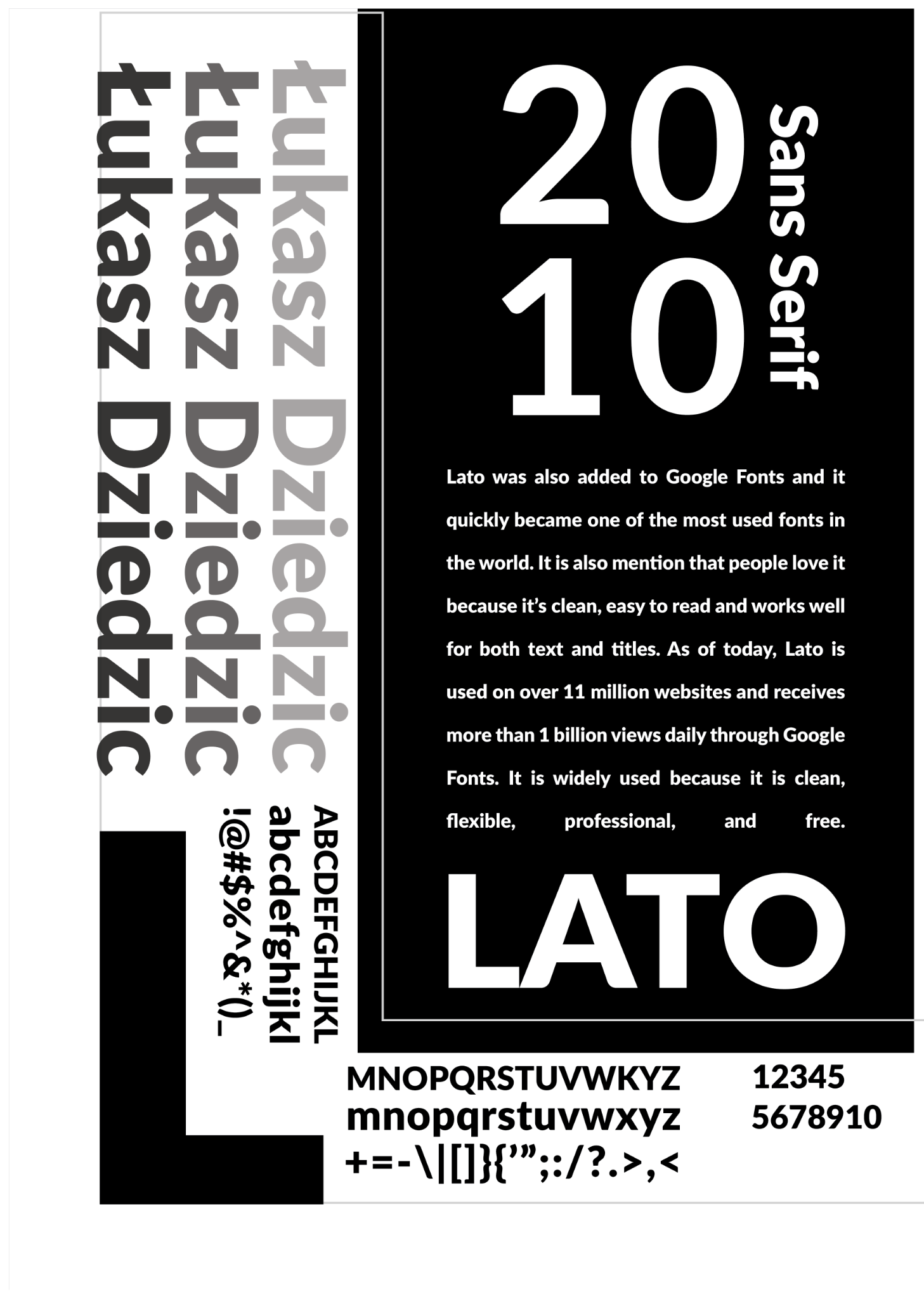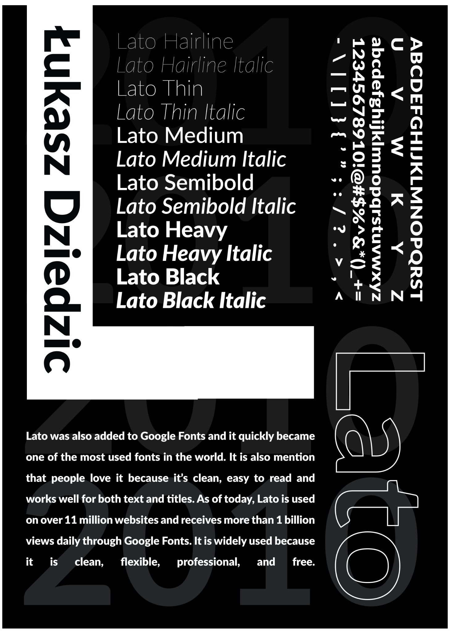 In this first draft design, I experimented with black and white, added ‘Łukasz Dziedzic’ to show who the designer is, and included the year the font was published. I also added an ‘L’ logo to emphasise that L stands for Lato.