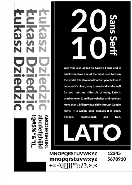 In the second design, I focused on showcasing the Lato font family and its different styles. I organized the font weights and italics in a clear hierarchy so viewers can see the range from Hairline to Black Italic. The designer’s name, Łukasz Dziedzic, is placed vertically to create visual interest and highlight the creator behind the font. I used a black and white color scheme to keep the design clean and professional, emphasizing readability and clarity. The text at the bottom explains Lato’s popularity and versatility, giving context about why it is widely used. I also included a large, transparent “2010” in the background and outlined letters on the right side to add depth and a modern, dynamic feel to the overall layout.
