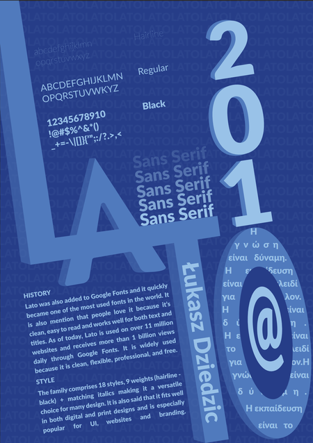 A finalised poster uses a monochromatic blue colour palette to create a calm, modern, and professional mood that reflects the personality of the Lato typeface. The layout is intentionally dynamic, with elements positioned in different directions to show movement while still keeping the design structured and readable. The large overlapping “LA” anchors the composition and visually represents the strength of the typeface, while the stacked “2010” adds height and draws attention to the year of its release. Repeated “Sans Serif” lines and varying font weights demonstrate Lato’s versatility and the vertical placement of the designer’s name adds contrast without disrupting the flow. The circular shape filled with Greek text and the @ symbol highlights Lato’s global usage and multilingual support, balancing the poster visually. Overall, the colours, positions and hierarchy work together to present Lato as a clean, flexible and contemporary typeface, communicated through a layout that is both playful and well-organised.